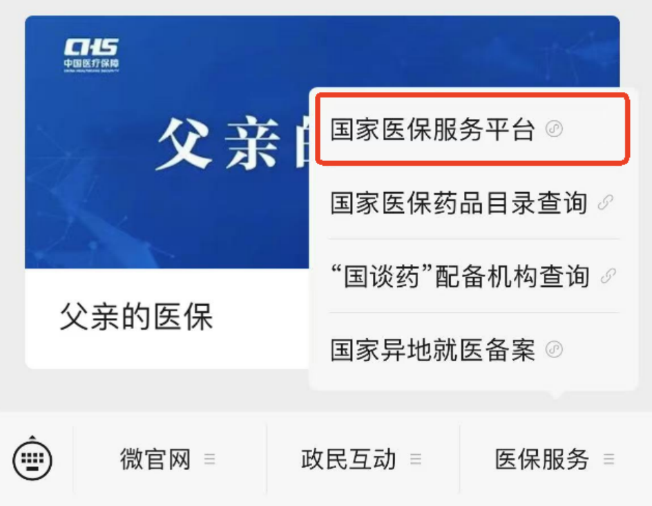 第一步:关注“国家医保局”微信公众号,点击医保服务→国家医保服务平台。