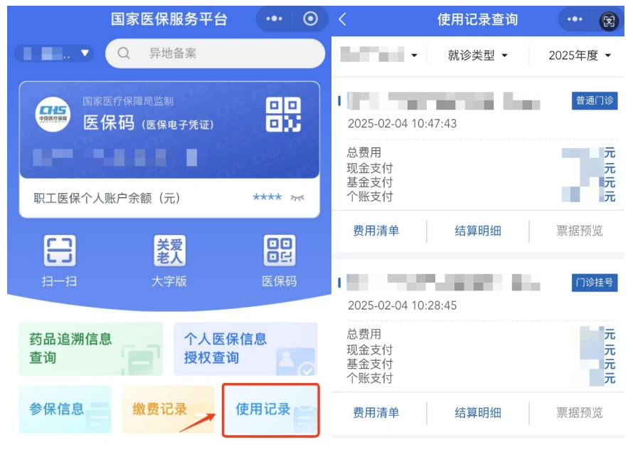 3.使用记录:点击“使用记录”可查询既往的就诊记录和支付信息,并可进一步查看费用清单和结算明细。