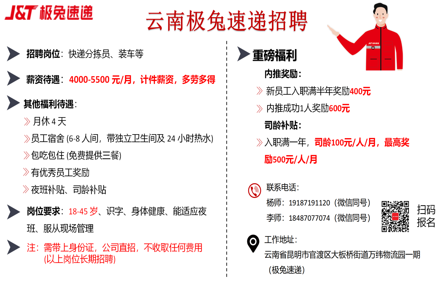 为帮助有意向性外出务工人员有序转移就业,云南极兔供应链有限公司、云南伍卫保安服务有限公司对我县进行招聘,现将招聘信息发布如下: