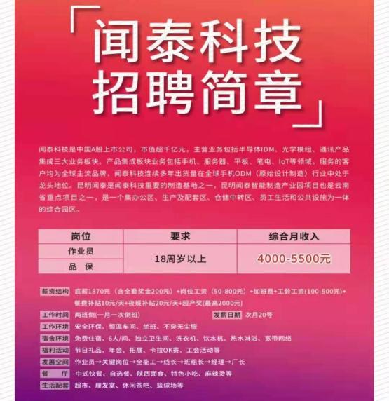 男女不限,年龄16-45周岁,会认字会说普通话,普通工装坐班,两班倒(一个月倒一次班),厂区环境好,伙食荤素搭配根据自己口味购买即可,住宿6人间,独立卫生间、洗衣机、热水器等应有尽有,员工工资同工同酬,可以交社保。