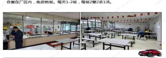 工作餐2顿免费,住宿免费6-8人间(厂内、外随机分)、水电费自理,住宿押金90元(其中80元卫生管理费,10元钥匙押金,满月全额退,未满月按5元/天扣除);需要坐厂车的0.7元/趟;住宿根据不同宿舍收取水电费用4-5.6元/人/天➕(10-65元的物业管理费)。