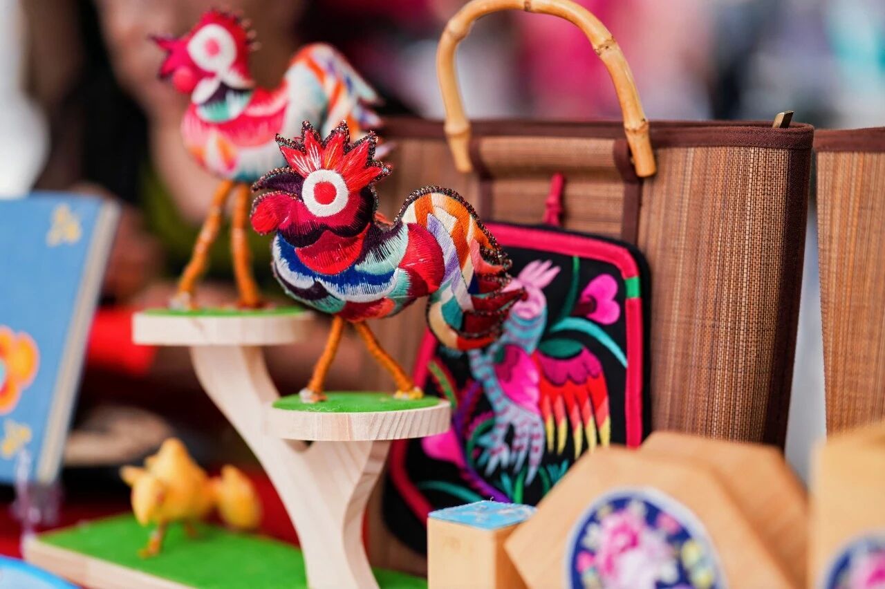 为让武定彝绣人才接轨更高层次市场,招商银行主动搭建开放合作平台,推动人才与高校、企业、市场深度对接。2025年6月,在招行的穿针引线下,武定县与云南师范大学艺术学院正式签署合作协议,共建非遗实践基地。高校设计团队深入猫街镇、白路镇等村寨采风,与招行培育的骨干绣娘联手,将象征吉祥的飞鸟纹、寓意五谷丰登的蜈蚣纹等传统符号,创新设计成围巾、笔记本、家居装饰等产品,研发出58个系列175件新产品,预计可新增订单500余万元。
