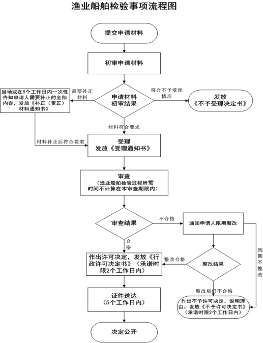 (一)具有许可权限的部门,对符合条件的,应当在5个工作日内作出许可决定,向申请人核发《内河渔船安全证书》、《内河小型渔船安全证书》。