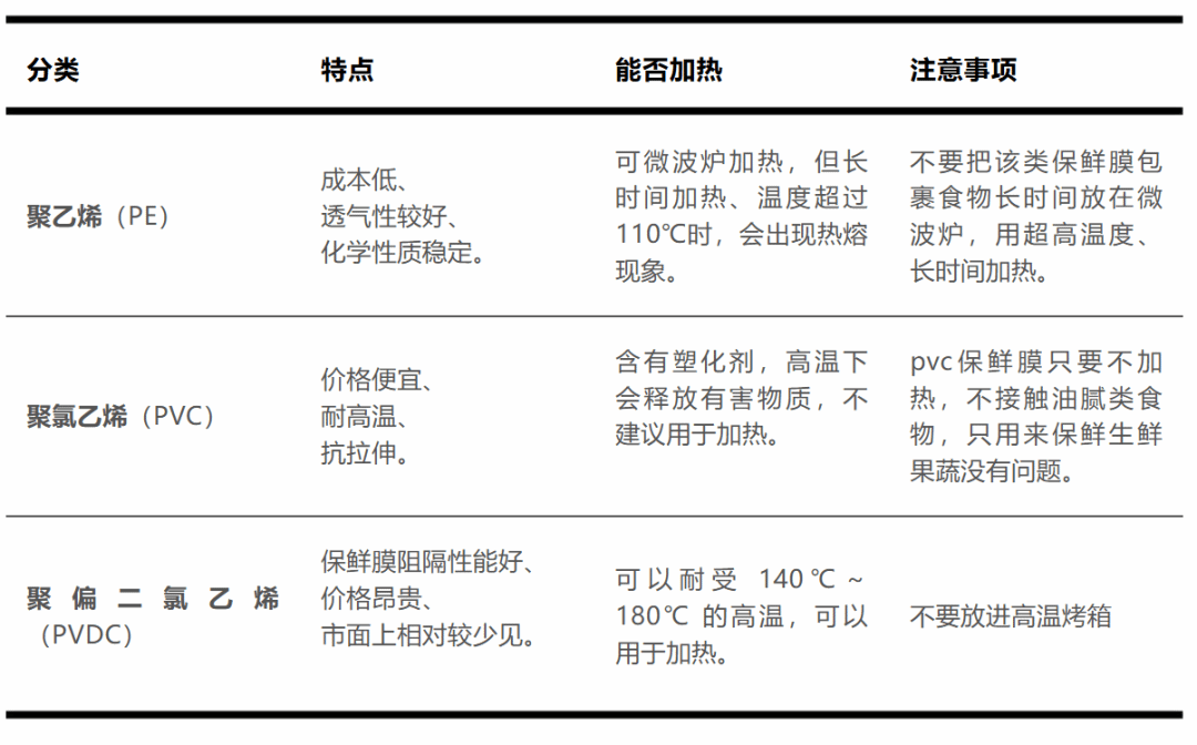 使用保鲜膜时,对于含有油脂,需要加热的食物,不要使用聚氯乙烯(PVC)的保鲜膜。这类材质,只能用于生鲜蔬果的保鲜。