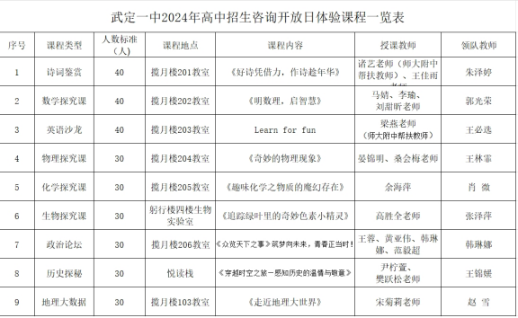 附一:武定一中2024年校园开放日体验课程一览表