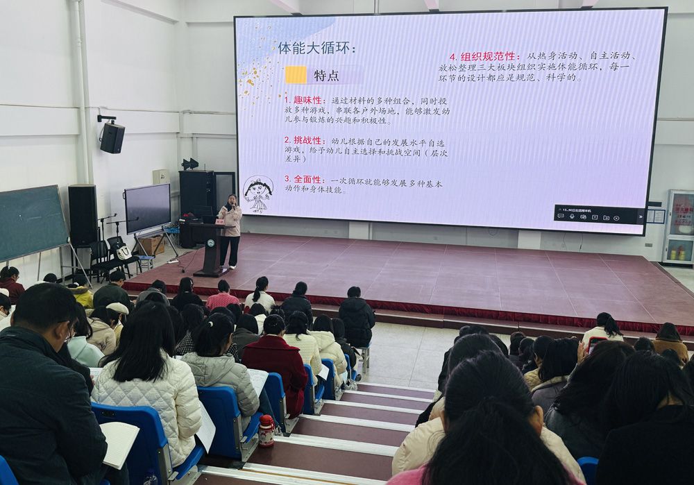武定县幼儿园党支部书记、园长李佳艳的《幼儿园一日活动组织与实施》专题讲座,立足乡镇幼儿园办园实际,围绕一日活动的科学规划、保教融合的深化策略、室内区域活动的场地规划与材料投放、户外自主游戏的场景设置与材料支持,以及坚守游戏基本活动、严防“小学化”倾向等重点内容展开系统阐述。武定县幼儿园副园长张晓琳的《幼儿园探究式环境创设的实施路径》专题讲座,紧扣《幼儿园保育教育质量评估指南》精神,从评估指南视角下的活动组织与环境创设要求切入,结合乡镇幼儿园环境创设现状分析,为幼儿园环境创设的基本原则及探究式环境创设提供了实践路径。武定县幼儿园党支部副书记张静的《以游戏化理念赋能健康成长—幼儿园体能大循环活动的组织与实施》专题培训,围绕幼儿身心发展规律,系统梳理了幼儿园运动活动的组织形式,重点从体能大循环的科学设计、规范流程与实施策略等方面进行深入解读,并结合典型案例开展分享交流与实操指导,有效提升了参训教师科学组织体能大循环活动的实践能力。