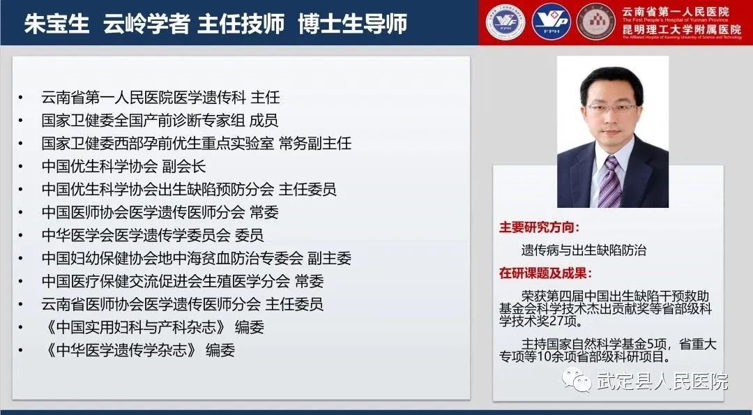 为帮助更多家庭正确认识出生缺陷,远离出生缺陷,云南省第一人民医院医学遗传科主任、博士生导师朱宝生,云南省第一人民医院医学遗传科副主任、硕士生导师章锦曼,应邀到武定县人民医院为广大家庭尤其产前筛查高危人群、面临优生遗传困惑的家庭提供科学合理的治疗方案和遗传咨询,让广大患者在“家门口”就能享受到名医名家的诊疗服务。