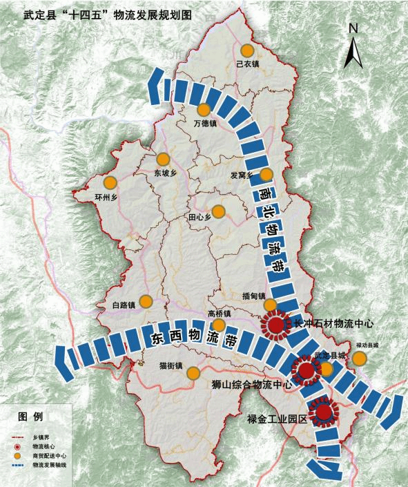 完善商贸物流通道,加快综合交通运输基础设施建设,构建“出滇入川、互联互通、衔接国内、对接国际”的公路、铁路、水运、航空、管道运输综合物流通道。以“两新一重”项目为抓手,加快狮山综合物流中心、禄金新型工业物流中心和长冲特色建材物流中心构成的武定综合物流园建设,推进高桥、猫街、插甸、白路、环州、东坡、田心、发窝、万德、己衣物流配送中心建设,形成“一园两轴三核多点支撑”的物流枢纽空间布局。即: