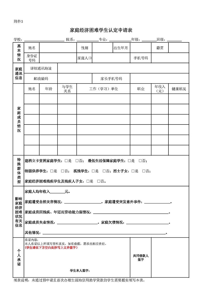 6.家庭经济困难学生认定申请表(原件1份,高三毕业生未通过预申请的学生需据实填写,本人和共同借款人签字确认;通过预申请的学生无需填写)。