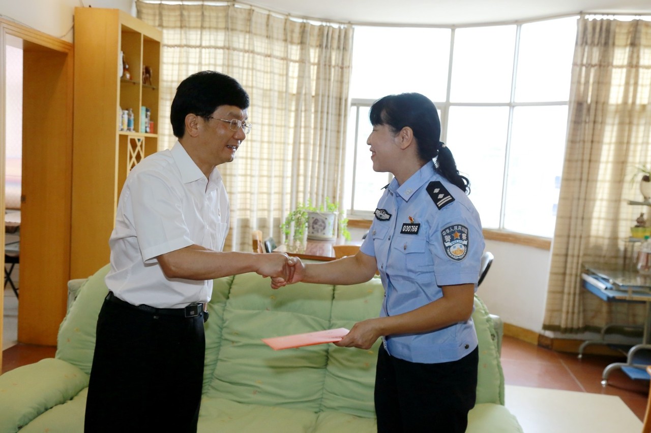 在庆祝新中国成立70周年大庆之际,9月23日下午,带着对公安民警和牺牲民警家属的关爱,楚雄州委书记杨斌一行来到武定,亲切看望慰问武定县因公牺牲民警杨致兴、李文芝的家属,并送上慰问金。叮嘱因公牺牲民警家属保重好身体、照顾好家庭、培养好孩子,有困难、有问题及时向组织反映,组织就是公安民警的坚强后盾。