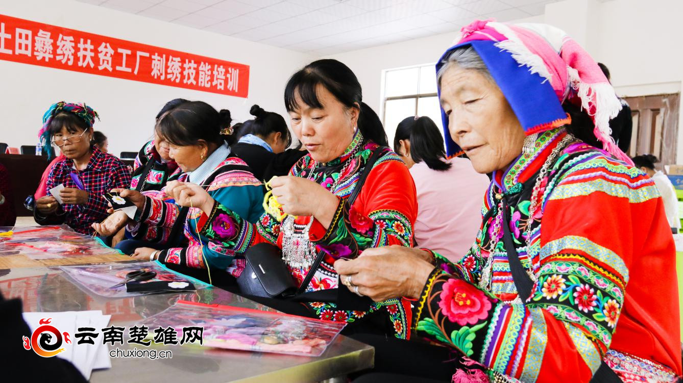 ( 图为武定县红土田易地扶贫搬迁集中安置点彝绣扶贫工厂的绣娘们正在接受培训)