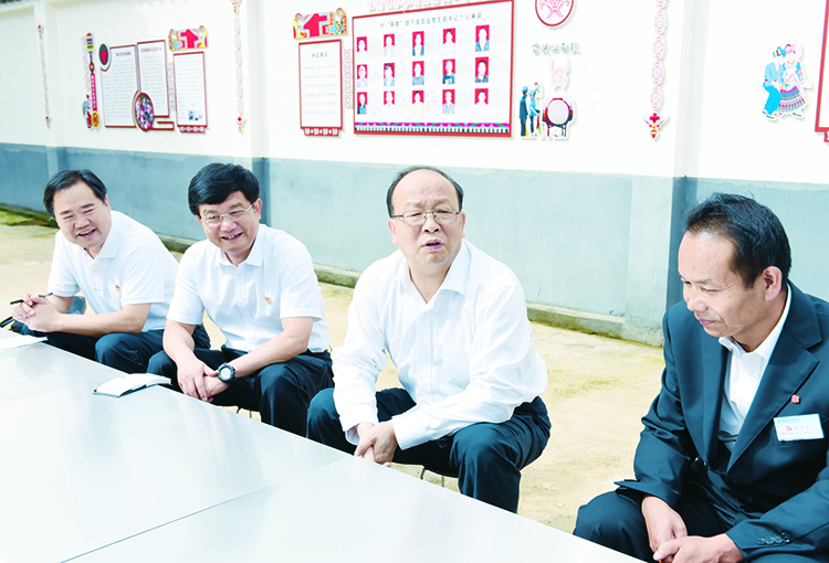 省委常委、省委组织部部长李小三在猫街镇永泉村委会开展脱贫攻坚工作调研座谈。 (记者 高建波摄)