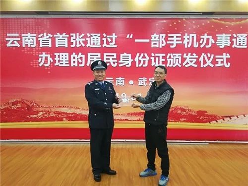 1月22日,云南省首张通过“一部手机办事通”补办的居民身份证在楚雄州武定县公安局狮山派出所成功申领。标志着云南公安机关创新便民惠民新举措再添便捷途径。