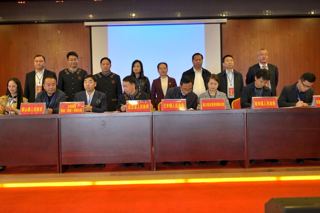 楚雄州投资促进局夏丽萍副局长代表州投资促进局作讲话,武定君材科技有限责任公司总经理汤春林、江西正邦集团云南片区总经理杨璞代表投资企业发言,王炳华副县长代表县人民政府就武定县的一些重点招商项目推介,并观看了武定县招商宣传片和重点招商引资项目推介视频片。最后,县委常委、常务副县长周庭质代表武定县人民政府与云南道地药业(集团)有限公司签订武定县附子生产加工基地建设项目,狮山镇人民政府、插甸镇人民政府、己衣镇人民政府分别与三家企业签订了合作协议。参加签约项目4个,即:附子生产加工基地建设项目、食用玫瑰种植及加工建设项目、特色石材木纹石红砂石产业整合项目、己衣滨江度假庄园建设项目,签约金额12亿元。