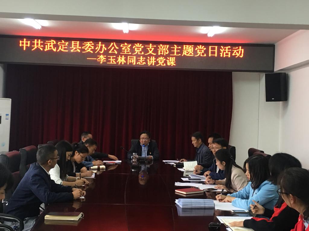 2019年4月3日上午,县委书记李玉林参加所在的县委办公室党支部的主题党日活动,并专题讲党课。会上,李玉林高度肯定了县委办的各项工作,指出县委办公室是一支信念坚定、忠诚担当、素质过硬的干部队伍,是一支完全可信任、可担重任、关键时刻靠得住的干部队伍。