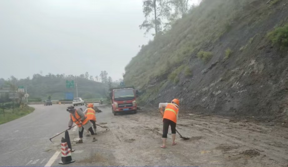 连日来,该路段受持续降雨影响发生坍塌,土石阻塞路面,对通行安全构成严重威胁。时值火把节,县交通运输局立即启动应急预案,科学制定清理方案,第一时间调集人员与机械赶赴现场开展清障工作。同时联合省交通综合行政执法局楚雄支队武定大队开展现场交通疏导保通工作。截至7月17日上午11时,全部坍塌土石清理完毕,边沟顺利疏通,危险路段同步设置安全警示设施,双向车道恢复正常通行能力。此次应急抢险累计投入人员30余人次,各类机械5台次,圆满完成路面安全保畅任务。