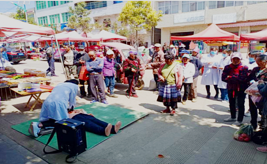 活动现场,医务人员用通俗易懂的语言向群众宣传胸痛自救方法,并且现场演示了心肺复苏急救方法。提供量血压、测血糖、诊疗、饮食健康指导等服务,指导患者用药,防范疾病发生、发展。现场同时通过发放宣传手册、健康宣教等方式向大家进行有关急性胸痛救治的宣传教育,讲解有关于心肌梗死、冠心病及心血管等相关疾病的知识。