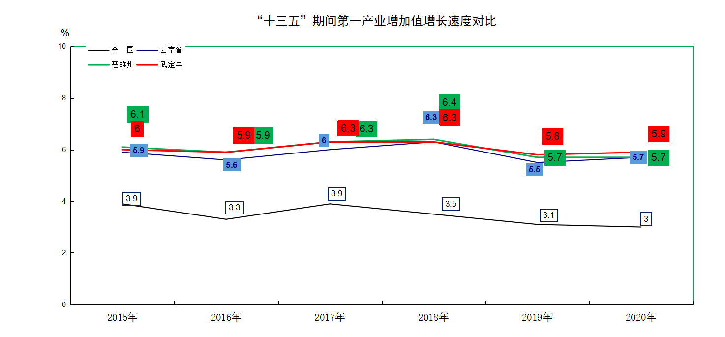 “十三五”期间,第一产业增加值年均增长6%,分别高于全国、全省、全州2.68、0.22、0.04个百分点。