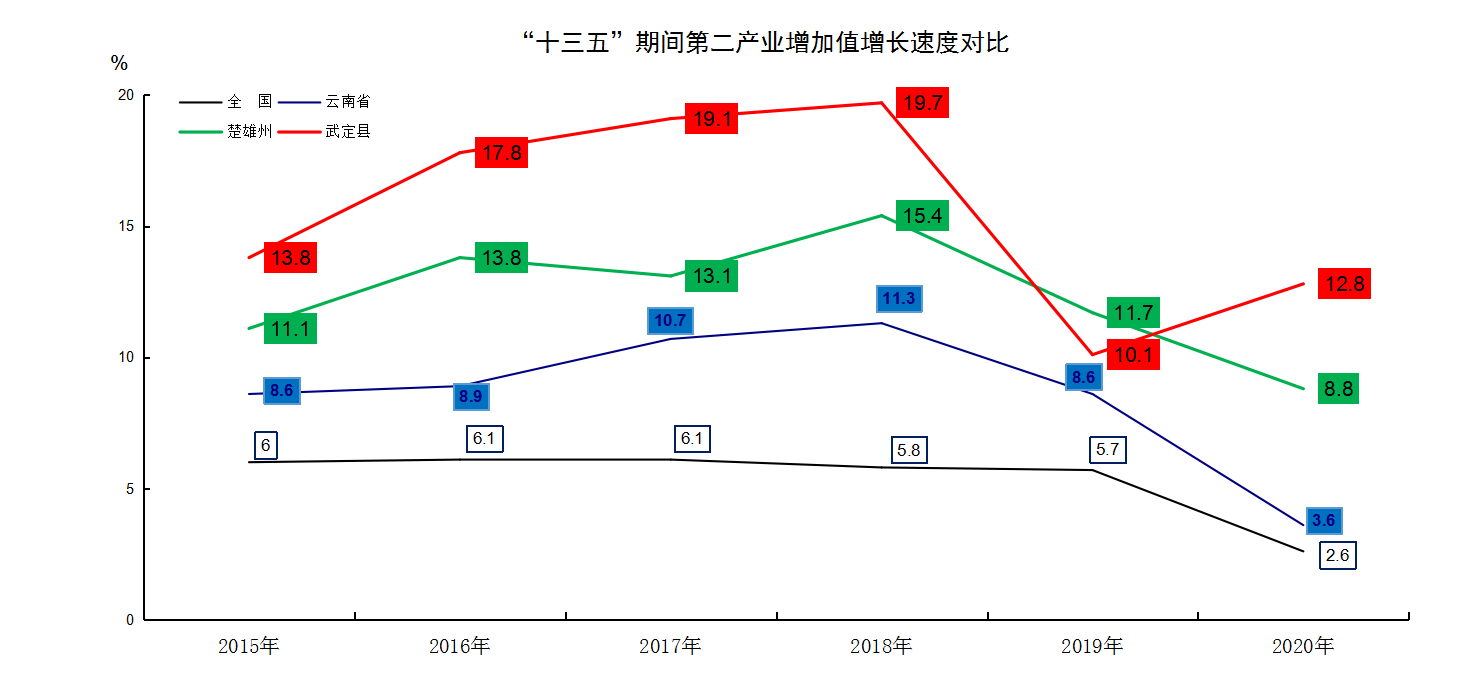 第二产业增加值年均增长15.8%,分别高于全国、全省、全州10.59、7.25、3.3个百分点。