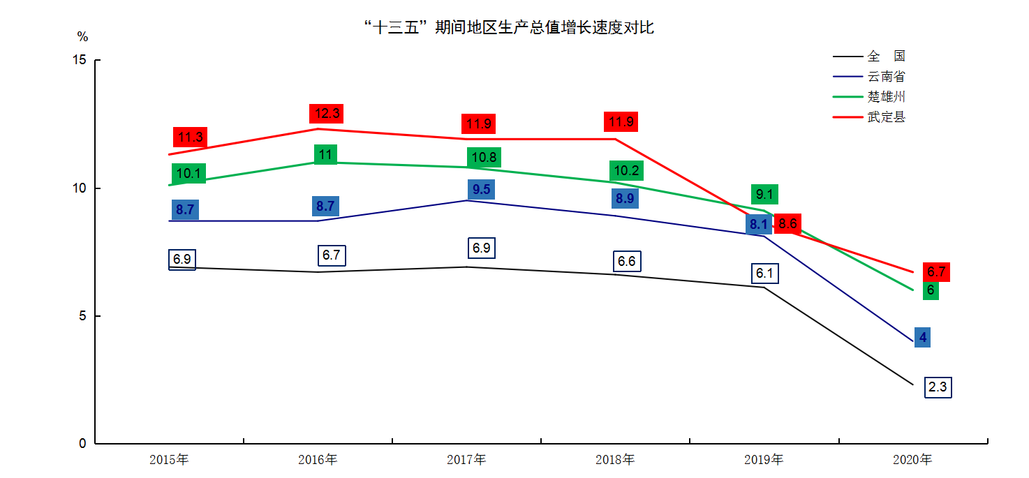 2020年末,武定县经济总量超百亿实现新突破、产业结构发生新变化、发展质量迈上新台阶,脱贫攻坚取得决定性、历史性胜利,如期脱贫,顺利实现“十三五”圆满收官,为“十四五”全县经济社会高质量发展开好局、起好步打下坚实基础。