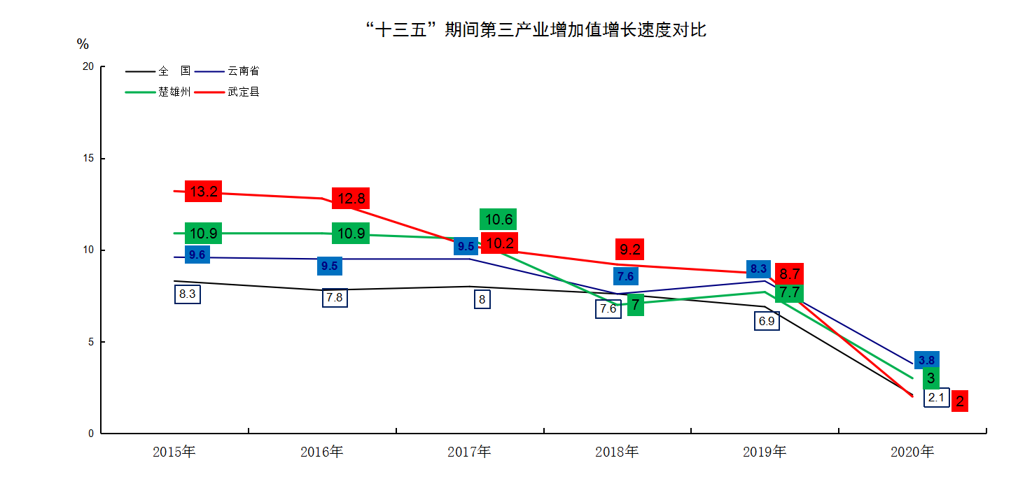 第三产业增加值年均增长8.5%,分别高于全国、全省、全州2.06、0.8、0.72个百分点。
