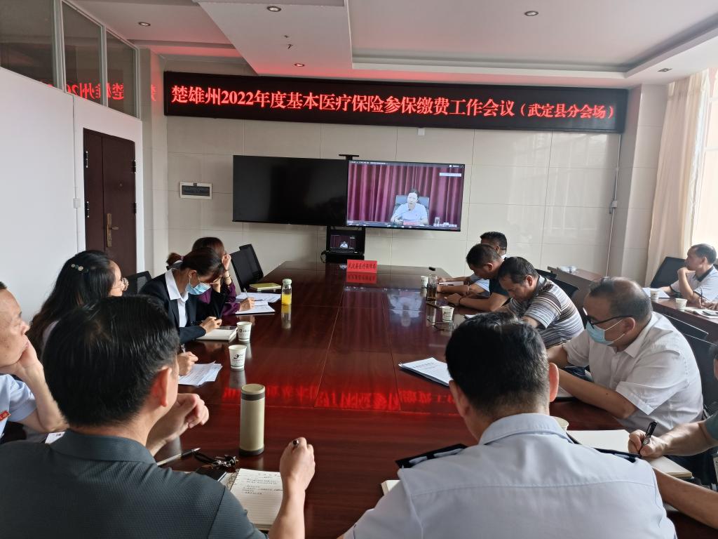 为全面总结2021年全州基本医疗保险参保工作,安排部署2022年基本医疗保险参保缴费工作,8月26日,州医疗保障局、州税务局联合召开全州2022年基本医疗保险参保征缴工作视频会议。武定县医疗保障局、武定县税务局、中国农业银行武定支行、武定县农村信用联合社等单位主要领导和分管领导、相关股室负责人及经办工作人员在武定县分会场参加会议。