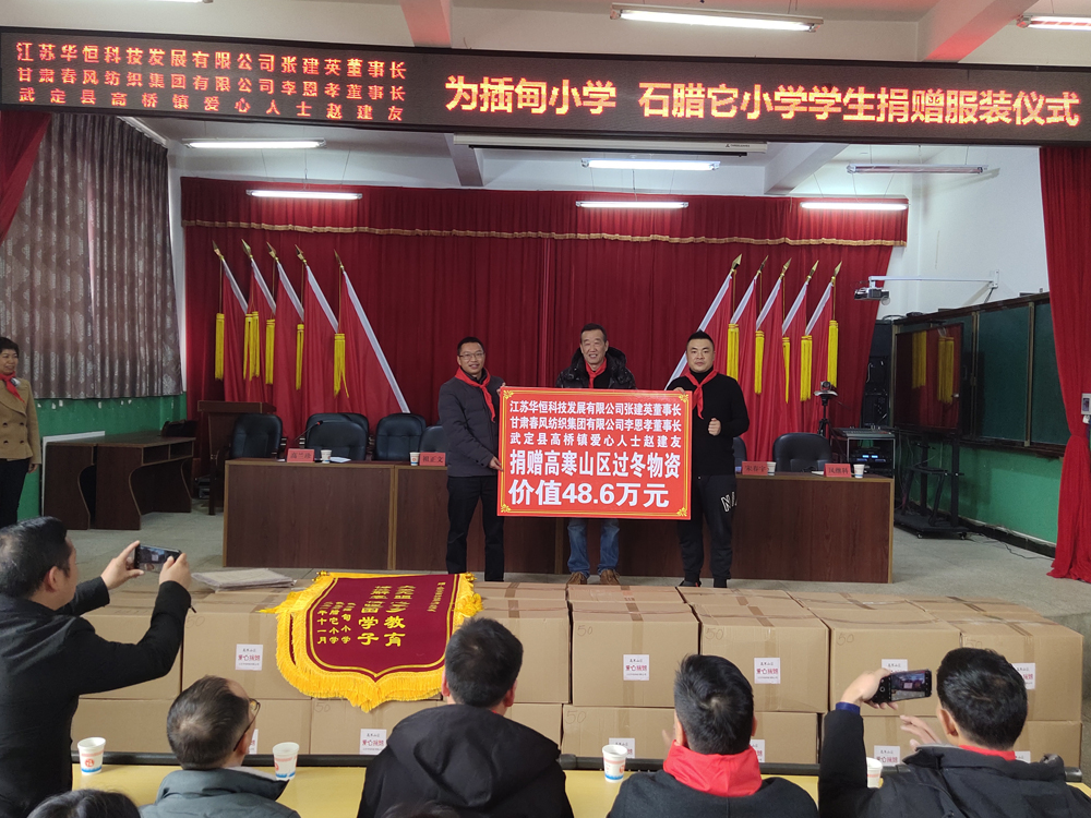 捐赠仪式由插甸小学高兰珍校长主持。少先队员代表为来宾敬献了红领巾;插甸镇党委副书记镇长宋春宇同志为本次活动致了欢迎辞;甘肃春风纺织集团有限公司李恩孝董事长作了讲话;武定县高桥镇爱心人士赵建友先生对广大学子们提出了殷切希望;武定县教育体育局书记局长祖正文代表武定县接受江苏华恒科技发展有限公司张建英董事长、甘肃春风纺织集团有限公司李恩孝董事长、武定县高桥镇爱心人士赵建友捐赠毛衣1620件,价值486000元。