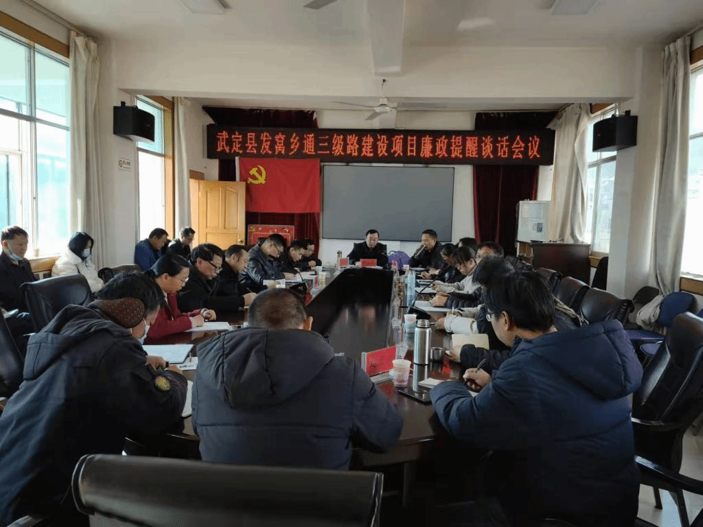 2021年12月22日下午,武定县交通运输局召开发窝乡通三级路建设项目廉政提醒谈话会议,局党组书记、局长饶正琨主持开展廉政提醒谈话。发窝乡通三级路建设项目业主各部门和设计、监理、施工等各参建单位项目经理及主要管理人员参加了会议。饶正琨指出,发窝乡通三级路建设项目是我县的重点民心工程,参建各方要提高政治站位,时刻绷紧防腐拒腐这根弦,强化红线意识,严守政治纪律和政治规矩,认真履职尽责,提高廉政风险防范意识。饶正琨要求,一要遵纪守法,依法依规实施项目建设。二要知行合一,严格程序推进项目建设。三要守好底线,切实构建亲清政商关系。四要互相监督,建设安全优质廉政工程。