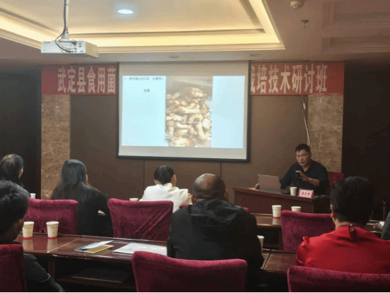精心筹备,有序开启研讨班序幕。9月24日,武定县食用菌联盟第二次会议暨林菌实用栽培技术研讨班正式开班,县委常委、县委办主任李文武总结了全县食用菌产业发展工作成效,分析了当前面临的机遇与挑战,并对下一阶段重点工作进行部署。开班仪式结束后,首场技术授课如期举行。特邀专家以“大球盖菇生物学基础及种植技术”为主题,从大球盖菇的生长习性、适宜环境条件、菌种培育、栽培管理及采收储存等方面进行详细讲解,并结合武定县气候土壤特点,给出针对性种植建议,参会人员认真记录、不时提问,初步掌握了大球盖菇规范化种植的核心要点。
