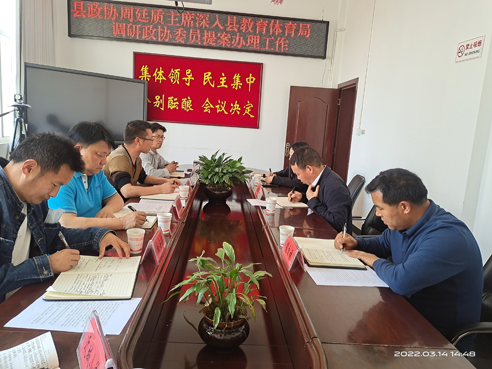 2022年3月14日,县政协周廷质主席、熊自禄副主席、提案委邵显舒等一行深入县教育体育局调研政协委员提案办理工作。县教育体育局局长祖正文、县自然资源局局长张顺猷、县教育体育局副局长喻春华、校安办相关同志和近城小学校长廖忠平参加了调研座谈会。