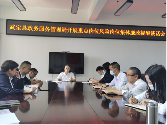 按照全面从严治党主体责任及党风廉政建设相关要求,为抓实抓细日常监督,关口前移,抓早抓小,进一步提高重点岗位、风险岗位人员的廉洁自律意识和拒腐防变能力,2022年5月10日下午,县政务服务管理局局长卢海燕召开重点岗位、风险岗位集体廉政提醒谈话会。
