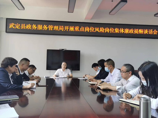 为深化中央八项规定及实施细则精神,锲而不舍加强纪律作风建设,持之以恒纠正“四风”,抓好领导干部这一“关键少数”,5月 10 日下午,武定县政务管理局组织局班子成员、部分重点岗位、风险岗位股室长召开重点岗位风险岗位集体廉政提醒谈话会。会上,局长卢海燕代表局班子对全体参会人员进行了集体廉政提醒谈话。