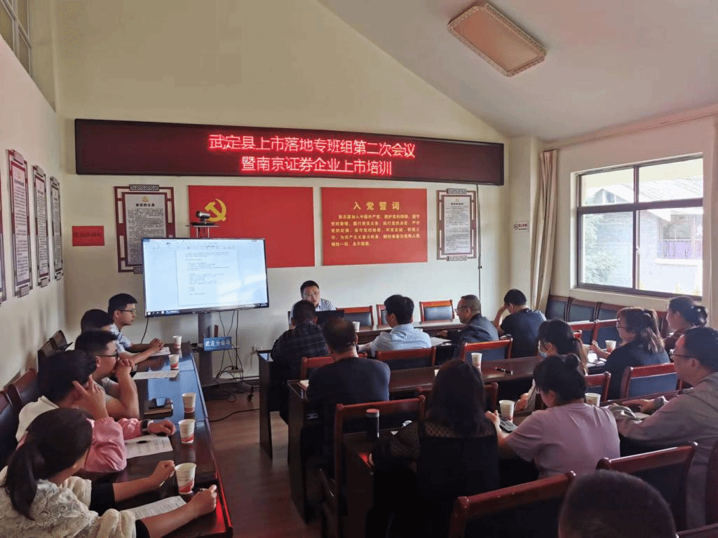 为贯彻落实武定县重点产业和重大项目专班推进制度,充分发挥武定县上市企业落地服务专班在推进武定县企业上市工作的服务保障作用。2022年6月9日,武定县上市企业落地服务专班召开武定县上市企业落地服务专班组第二次会议暨南京证券企业上市辅导培训。会议中南京证券楚雄分公司曾超老师做了题为“多层次资本市场发展路径选择”的讲解培训,从企业上市条件、上市确定性、投资者数量等方面,结合我县企业发展实际情况做了讲解,专班组成员及参会的部分企业针对培训内容做了现场提问,南京证券楚雄分公司曾超老师一一回复了意见建议,参会企业均表示此次培训内容深入浅出、知识点安排紧凑有序,意见建议可操作性强,参加培训提高了企业做大做强,发展上市的决心。