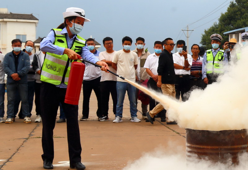 农机事故应急处置演练结束后,县消防救援大队负责人为全体参演人员进行了消防知识和应急逃生等知识讲解,对灭火器等使用知识进行现场培训,并进行火灾救援现场防火、灭火演练。