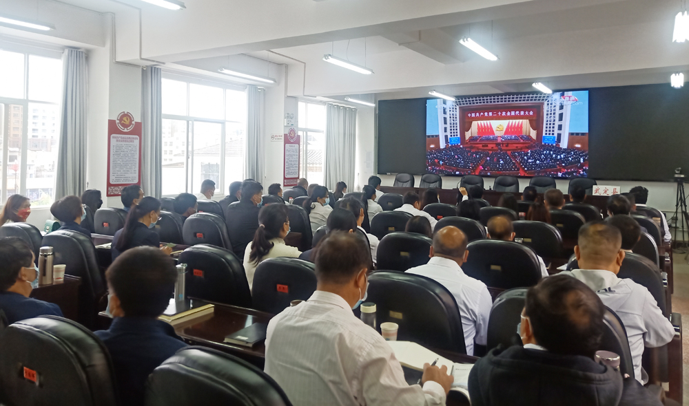 2022年10月16日上午10时,中国共产党第二十次全国代表大会在北京隆重开幕,习近平总书记代表十九届中央委员会向大会作报告。武定县教育工委、武定县教体局党组组织机关全体职工、各学校教职员工、学生34167人通过电视、手机、网络直播等多种形式收听收看中国共产党第二十次全国代表大会开幕会直播盛况。