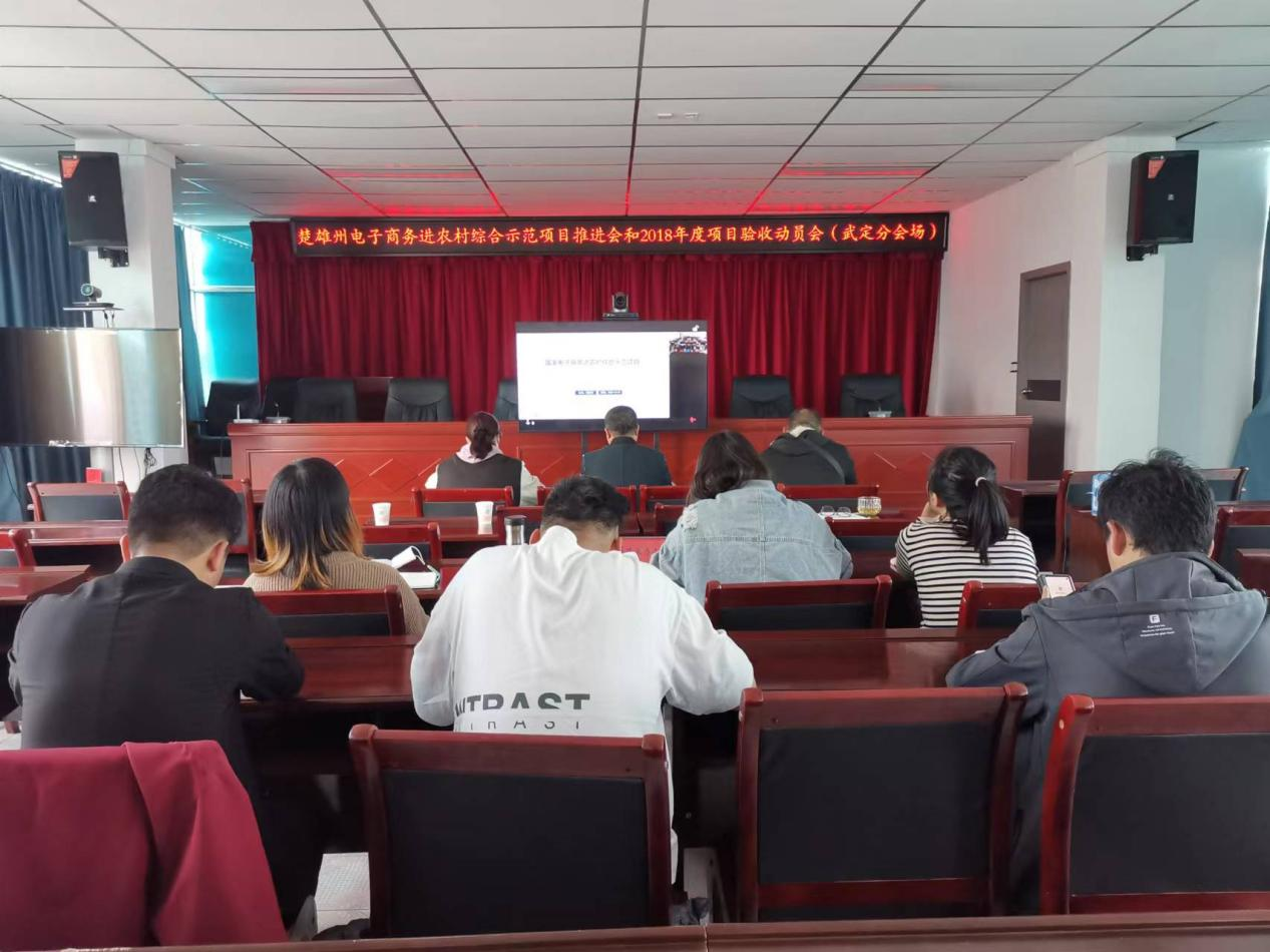 会议由楚雄州商务局副局长李银主持并讲话,州商务局分管领导、电商科负责人、财务人员,州财政局、州乡村振兴局业务科室负责人,州级统筹项目承办企业负责人及财务人员,第三方专家组(验收机构)等参加主会场会议;各县市(商务局)工信商务科技局分管领导、具体业务人员,县财政局、县乡村振兴局业务股室负责人,项目承办企业等参加分会场会议。武定县工信商务科技局设立分会场,县工信商务科技局电商工作的分管领导潘培金、电子商务公共服务中心负责人李娟及具体业务人员,县财政局、县乡村振兴局业务股室负责人,武定县2018年电子商务进农村综合示范项目承办企业春夏秋冬电子商务有限公司等参加了会议。