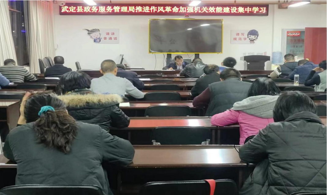 全县推进作风革命加强机关效能建设开展以来,县政务服务管理局坚持规定动作全覆盖、自选动作有特色,结合《云南省推进作风革命加强机关效能建设的若干规定(试行)》,积极构建高效协调一抓到底的工作体系,推动作风革命效能革命大提升专项行动与业务工作同频共振、深度融合,努力锻造忠诚干净担当的高素质队伍,为武定高质量跨越式发展贡献力量。