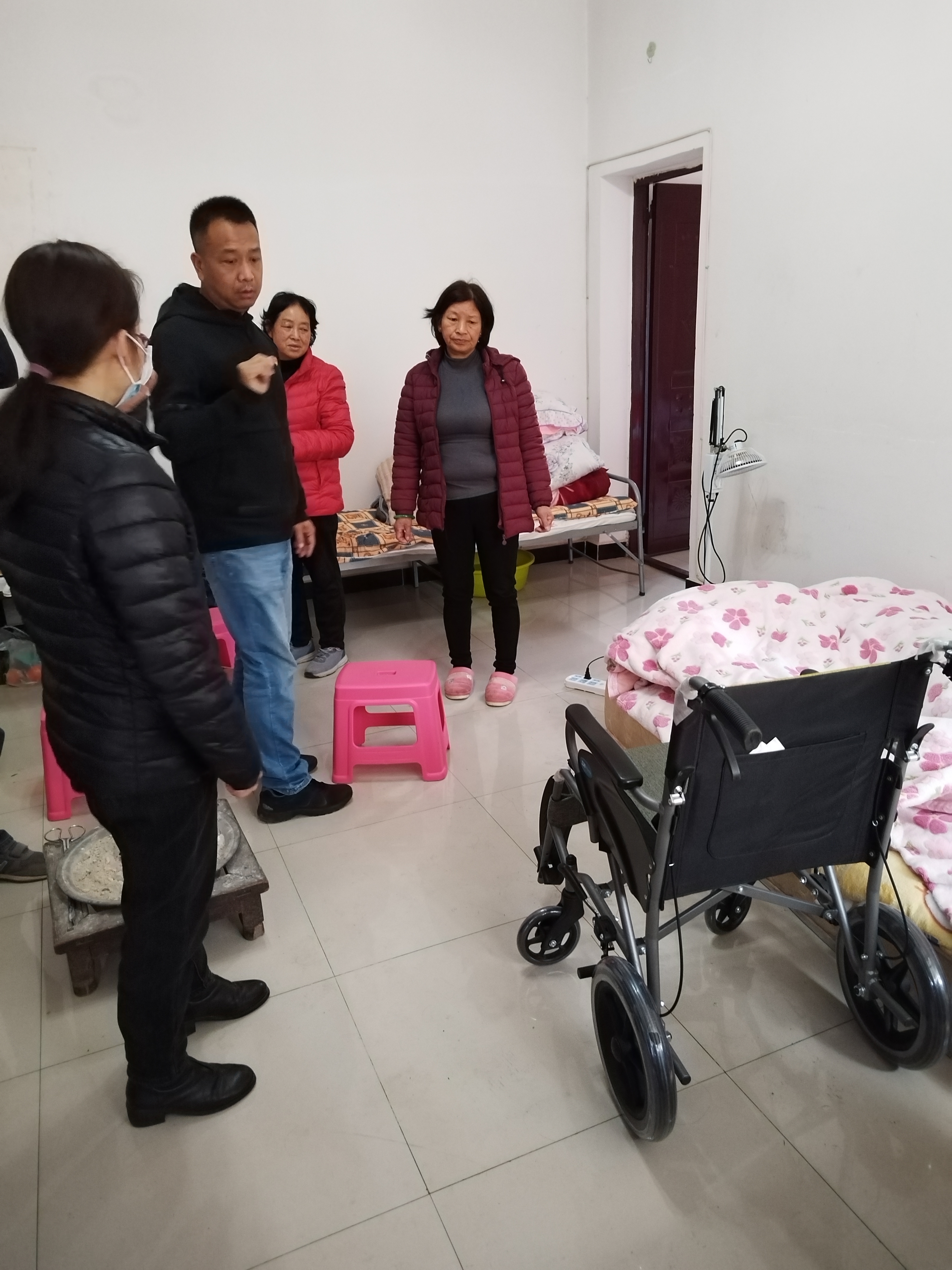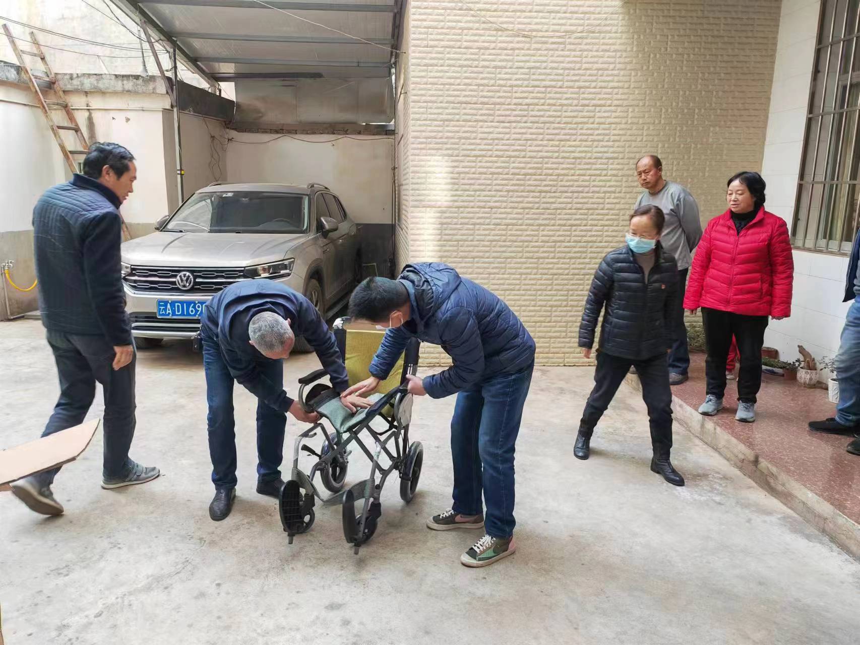 陈玉兰是武定县狮山镇享受定期抚恤补助的烈士遗属,因年事已高,行动不便,今年2月初在院子里不慎摔倒导致右腿骨折,在医院治疗两周仍无明显好转。县退役军人事务局知晓情况后主动上门走访询问,了解其家庭困难和帮扶需求,得知陈玉兰奶奶行动不便急需一张轮椅后,局党组班子及时研究部署,安排专人负责购买并亲自将轮椅送到陈玉兰奶奶家,表达了党和政府对烈士遗属的关心关爱。