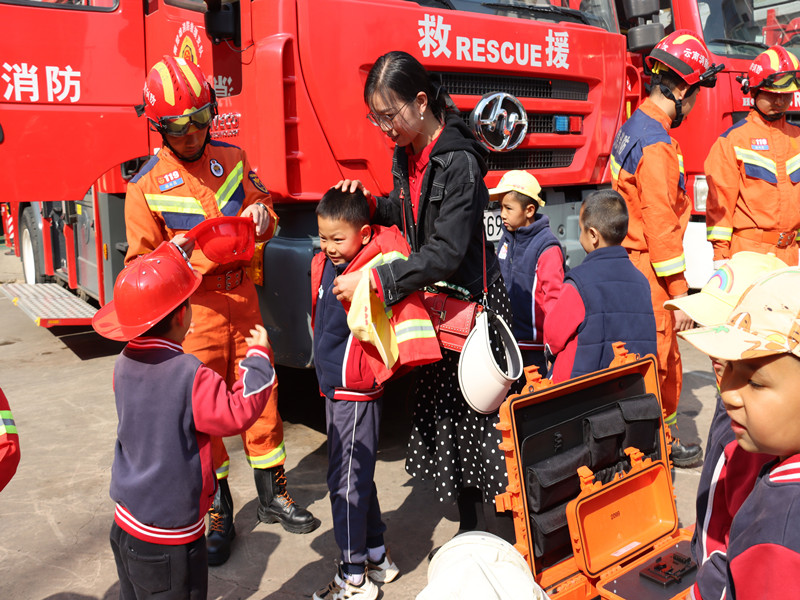 孩子们一走进营区,就被眼前的消防车及各种“稀奇古怪”的消防器材所吸引。消防救援人员带领师生及家长参观了消防车辆和装备器材,详细介绍了各类车辆装备器材的具体用途、基本性能和使用方法,并邀请师生家长们试穿体验消防员服装,孩子们好奇地摸着消防战斗服、水枪、空气呼吸器、消防车等不断提出各种问题,“叔叔,这个是干嘛的?”“叔叔,这个东西怎么用啊?”消防员耐心一一解答,并不失时机地为孩子们讲解火灾预防、发生火灾时如何拨打119电话、如何逃生等消防安全知识,并叮嘱孩子们在平时一定不要玩火。消防员叔叔讲到精彩或者孩子们感兴趣的器械时,孩子们都会开心地鼓掌,孩子们一张张崇拜与喜悦的笑脸上写满了崇敬与欢乐,现场气氛异常活跃。当孩子们来到消防员叔叔的宿舍,映入孩子眼帘的是平整的床单、豆腐块一样的被子,整齐排列的水杯、帽子……孩子们发出了一声声感叹和表扬,特别是当消防员叔叔为小朋友们演示折被子的环节,孩子们激动地鼓掌,还有一些孩子喊起了表扬口号“棒棒棒,叔叔你真棒,谁都比不上!”
