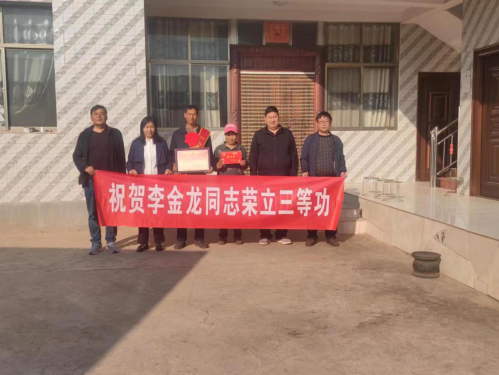 今天送上的喜报是狮山镇铺西村委会白沙村29号李金龙家,李金龙2011年入伍,迄今已经入伍12年,今天我们来给他送的是三等功,退役军人事务局局长龙在成为其家属佩戴光荣绶带,送上立功喜报和奖励金,龙在成说道:祝贺你家,这份荣誉来之不易,一人立功,全家光荣,这份光荣,既属于立功受奖的军人,也属于千千万万背后默默付出的军属。李金龙父亲接过喜报和奖励金说道:感谢党、感谢政府,为我们创造条件,培养人才,我们将再接再厉,争取再立新功。