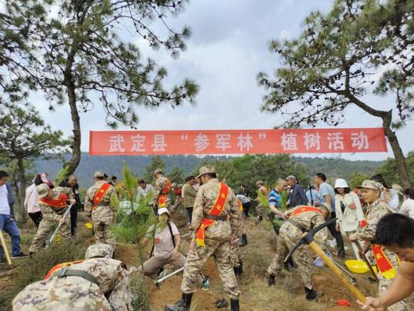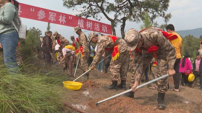 植树现场,新兵们把吃苦耐劳精神投入到紧张的植树劳动中,大家手拿工具、互帮互助、密切配合,认真按照每一道植树工序要求,扶苗栽植的、铲土填坑的、培土压实的,提桶浇水的,虽然鞋上沾满了泥土,但脸上尽是笑容,一派的繁忙景象把旁边石头上“参军林”三个鲜红的大字映衬得格外明亮闪光。
