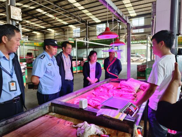 为进一步抓好非洲猪瘟防控工作,规范全县生猪产品经营监管,确保生猪产品质量安全,切实维护人民身体健康和公共卫生安全,严厉打击“私屠滥宰”等违法违规行为。9月6日,武定县重大动物疫病防控指挥部抽调县农业农村局、市场监督管理局、公安局、工业信息化商务科技局等相关部门人员,对县城生猪产品经营市场及超市开展联合执法检查。