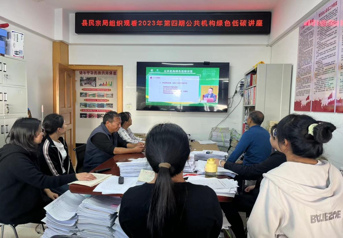 为深入学习贯彻党的二十大精神和全国生态环境保护大会精神,引导公共机构干部职工加强对碳达峰碳中和基础知识、实现路径的学习领会,深刻认识积极稳妥推进碳达峰碳中和的重要意义,不断推动公共机构能源资源节约和生态环境保护工作高质量发展,县民族宗教局于10月27日上午9:00组织干部职工10人,观看依托清华大学云课堂平台举办的2023年第四期公共机构绿色低碳讲堂。
