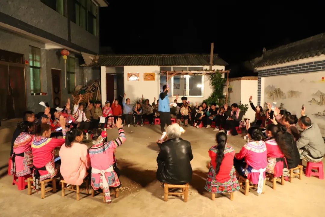 “哩咦~遇事千万莫冲动,寻找法律明白人。法治社会法保障,利国利民其欢唱~哟嚯,”随着普法文艺队长蔡绍荣弹起三弦,唱出彝家调,大家纷纷起身围着火塘,和着节拍跳起了猫街“八脚穿花”跌脚舞,将活动推向了高潮。