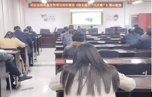 会上,一是组织全体干部职工学习《武定县推进作风革命效能革命典型案例通报》;二是集中观看了《修不通的大庄路》警示教育片,一幅幅震撼的画面,服刑犯人现身说法、犯罪经历和忏悔……这一幕幕、一出出,触目惊心,一声声、一句句,发人深思。他们的违法行为,最终踏上一条走不通的路。引导全体干部职工要加强自我约束、自我监督,知边界、明底线,提高正风肃纪的自觉性和坚定性。三是党组书记结合警示教育片,开展了集体廉政提醒谈话,强调三方面,一要坚定理想信念,守住党员“底线”。全体干部职工要自觉增强党性修养,政治上清醒坚定、重大问题上旗帜鲜明、关键时刻和重大事件中经得起考验,树立正确的世界观、人生观、价值观。二要严于律己,不碰“高压线”。权力是一柄“双刃剑”,每一个干部都只是权力的行使者,权力只能用来为老百姓服务,而不能用来为自己服务。要敬畏法纪,坚决不碰“高压线”。三要坚持原则“敢担当”。全体党员干部要讲担当,严肃政治纪律、生活纪律、工作纪律,强化担当、廉洁履职,齐心协力全力冲刺,实现全年工作任务“大收官”。