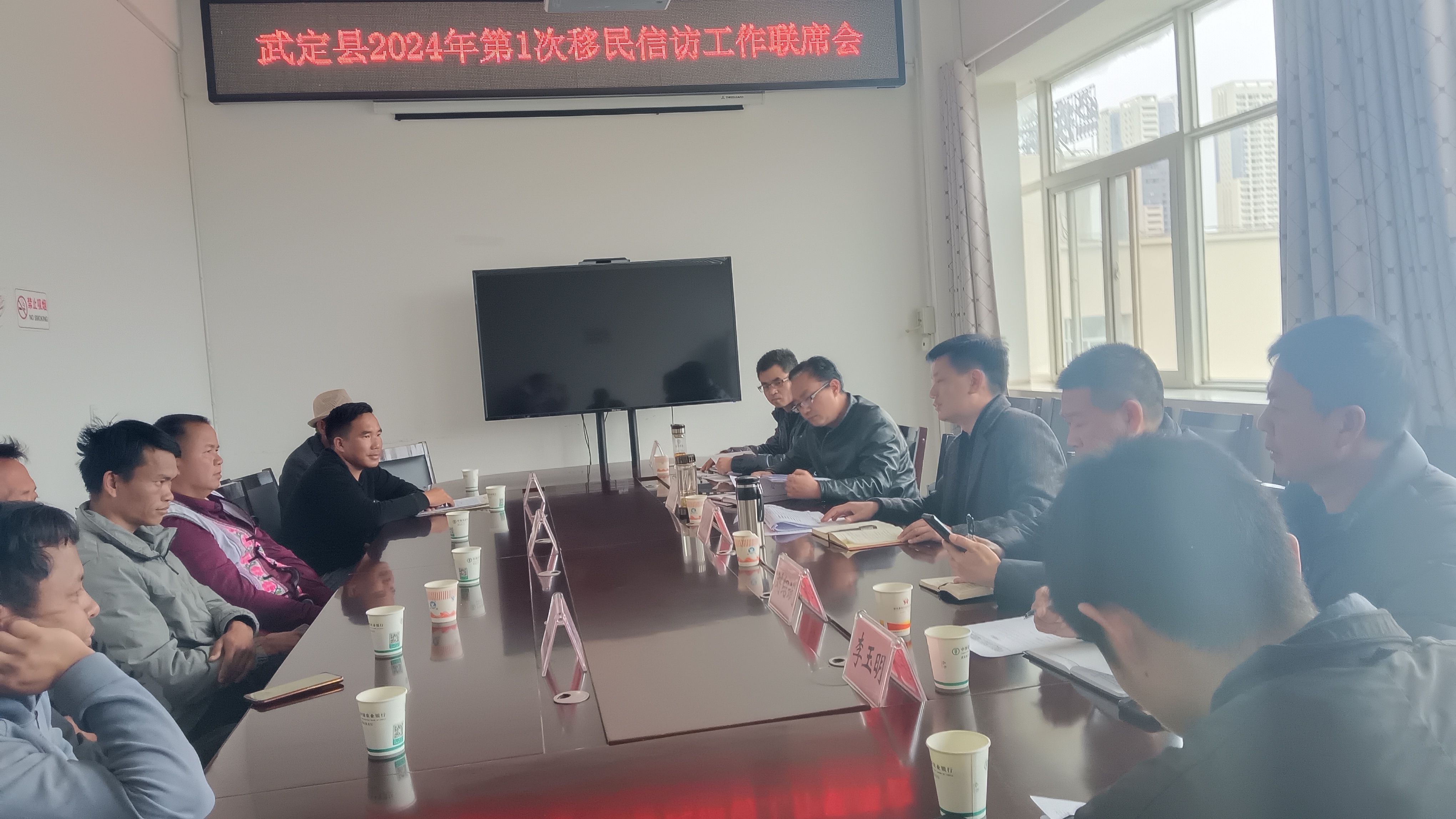 2024年2月2日下午,武定县在县搬迁安置办召开2024年第1次移民信访工作联席会,现场接访化解己衣镇更德村委会小平地村民小组与基咪作、下木老村移民村组淹没土地补偿资金分配矛盾纠纷问题。县信访局局长赵剑波,县移民指挥部副指挥长刘绍斌,县搬迁安置办主任杨绍君、副主任孙文,己衣镇人民政府副镇长李玉明,己衣镇乌东德水电站库区小平地、基咪作、下木老3个组发生纠纷的村组群众代表6人参加会议。
