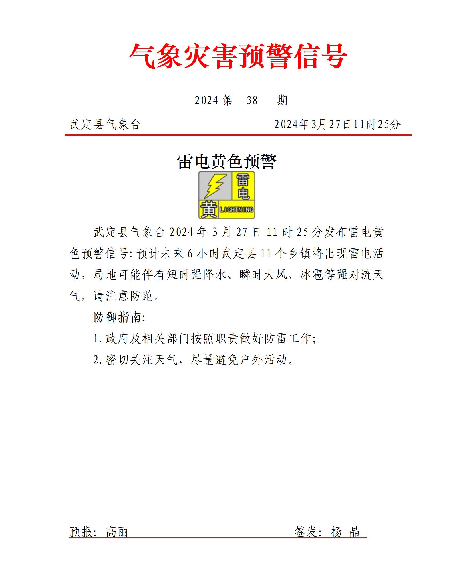 武定县气象台3月27日11时25分发布雷电黄色预警,预计未来6小时武定县11个乡镇将出现雷电活动,局地可能伴有短时强降水、瞬时大风、冰雹等强对流天气。