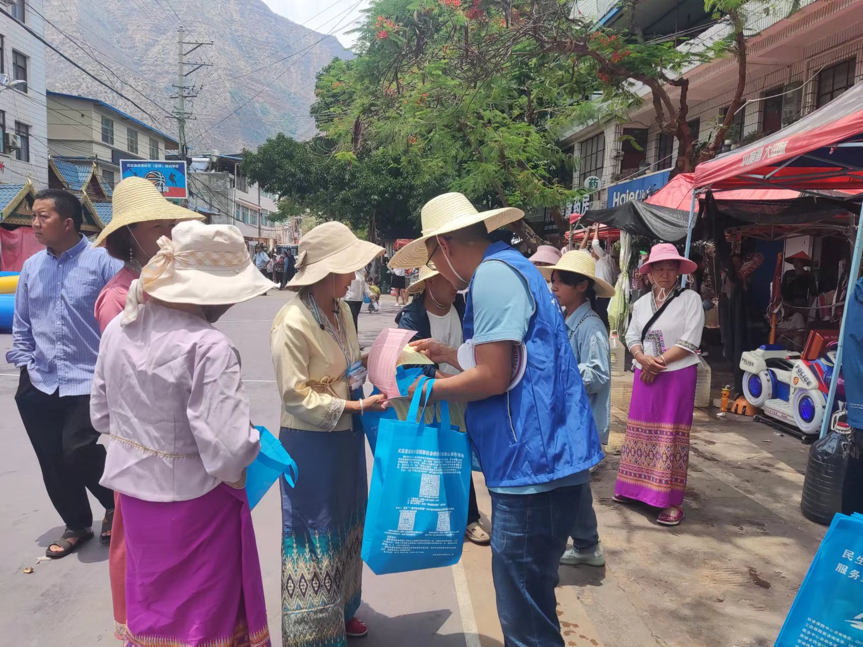 近日,正值东坡傣族乡“四月八”泼水节传统民族节庆,大街小巷到处热闹非凡,充满节日的味道。武定县人力资源和社会保障局“康乃馨”服务队员充分利用有利时机深入到东坡乡,与当地干部职工一起开展社保政策宣传活动,做到服务群众“零距离”。
