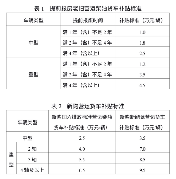 支持提前报废国三及以下排放标准营运类柴油货车,加快更新一批高标准低排放货车。对提前报废国三及以下排放标准营运柴油货车、提前报废并新购国六排放标准货车或新能源货车、仅新购符合条件的新能源货车,分档予以补贴。轻型货车或非营运货车、已获得中央其他资金渠道支持的车辆,不纳入本次补贴资金支持范围。