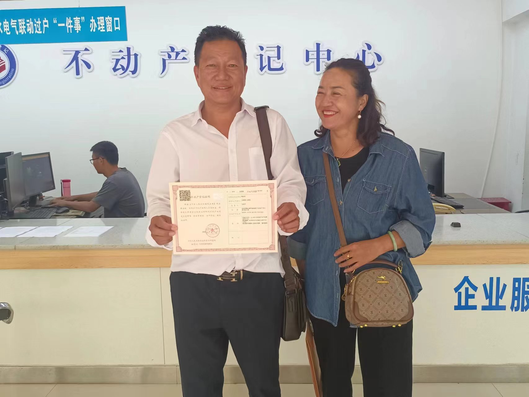 2024年9月10日,王朝清、白海凤夫妇到武定县不动产登记中心咨询了解有关居住权登记的政策和流程,想要在为女儿购置的坐落于武定县狮山镇环城南路22号农机厂内23栋6层601室的房屋中办理居住权登记,不动产登记中心接到申请后,主动与州不动产登记中心、系统运维公司沟通,积极学习居住权登记业务相关知识,在州不动产登记中心的精心指导下、在登记系统运维公司及工作人员的密切配合下,9月11日下午,王朝清、白海凤如愿办理了居住权登记,当夫妻二人从不动产登记中心工作人员手中接过不动产登记证明的时候,脸上洋溢出灿烂的笑容,口里只夸赞:“原本只是抱着咨询了解的心态,确没想到办成了,而且速度还那么快、那么高效,并连连说谢谢”。